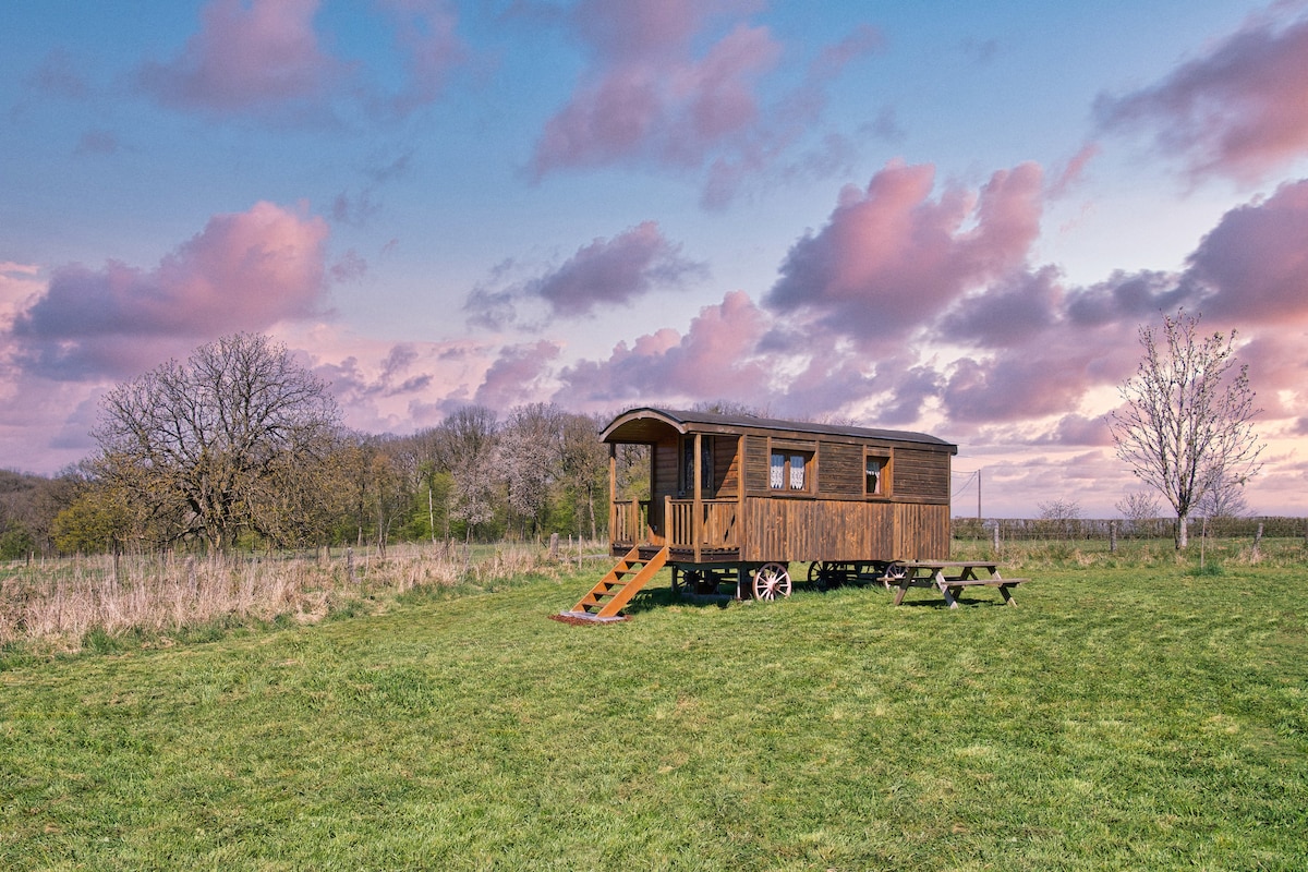 Besoin d'un séjour insolite ? Ce gîte est l'endroit idéal où s'évader, rien qu'à deux... Réalisée par un artisan menuisier, chaleureuse roulotte ! ici, tout a été construit sur mesure pour vous offrir un maximum de confort. Le matin, réveillez-vous avec le chant des oiseaux puis prenez votre petit-déjeuner sur la terrasse en admirant la vue sur les champs et les vaches Highland. Relaxez-vous ensuite, en amoureux, dans le bain nordique extérieur avant de partir en promenades