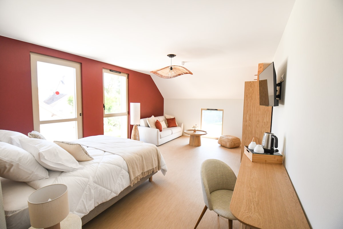 La Chambre Rouge Amour située au 2ᵉ étage de la maison de maître, avec un lit king size, d’une TV, d’un espace thé/café avec bouilloire. Vous partagerez une salle de bain avec douche, lavabo et WC . Le petit déjeuner est offert à Maison BÖ servi en buffet ou à table (un plateau petit déjeuner en chambre! sur demande la veille) À l’extérieur : cour intérieur, bar à cocktails et Jacuzzi. Le soir: Proposition de planches gourmandes à partager à partir de 20 euros. Pensez à réserver votre table