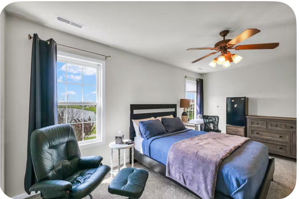 Forget your worries in this spacious and serene space. Lots of sunlight in this bedroom and enjoy the private full bathroom. It has everything you’ll need including TV with Roku, desk, walk-in closet, and reclining chair with ottoman.