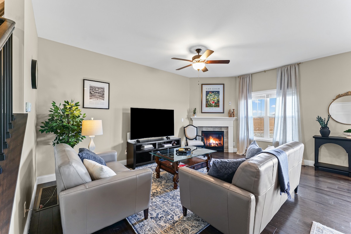 Comfortable, clean 3BR/2.5BA townhome in a quiet cul-de-sac with farm views—15 min to U of I. Master suite with queen bed and en-suite bath. Guest room with queen. Bunk room with full-size beds. Half bath on main floor for convenience. Gas fireplace, smart TVs, high-speed Wi-Fi, washer/dryer, fully equipped kitchen. Private driveway and garage fits 4 cars. Ideal for graduation, football weekends, or family visits. Larger group? Ask about booking both townhomes together.