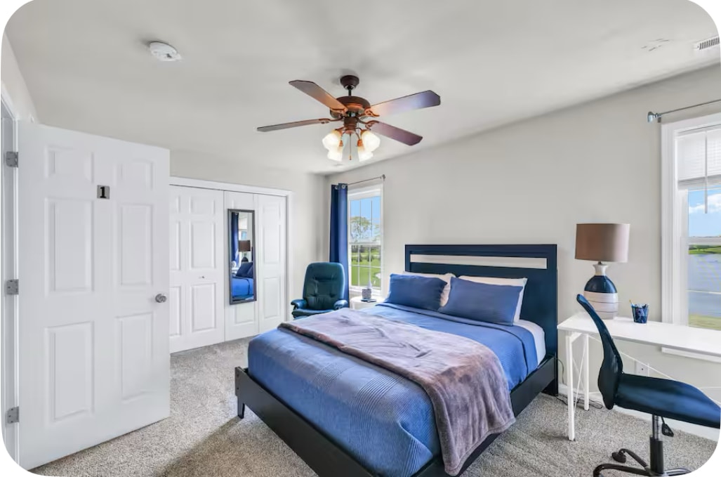 Forget your worries in this spacious and serene space. Lots of sunlight in this bedroom and enjoy the private full bathroom. It has everything you’ll need including TV with Roku, desk, walk-in closet, and reclining chair with ottoman.