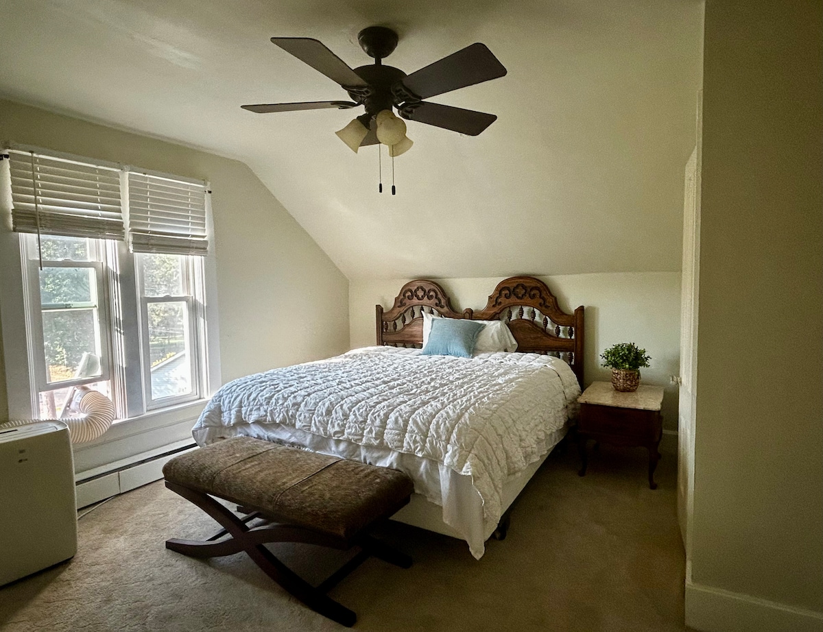 Welcome to our charming 3rd-floor studio located within a Victorian home in the heart of the NE Arts district! This cozy retreat boasts an abundance of natural light streaming in through skylights, illuminating a space adorned with beautiful plants, creating a serene and inviting ambiance. This delightful haven features a warm fireplace perfect for cozying up on chilly evenings. Please note, there is some low clearance near the head of the bed and in the bathroom/kitchen area.