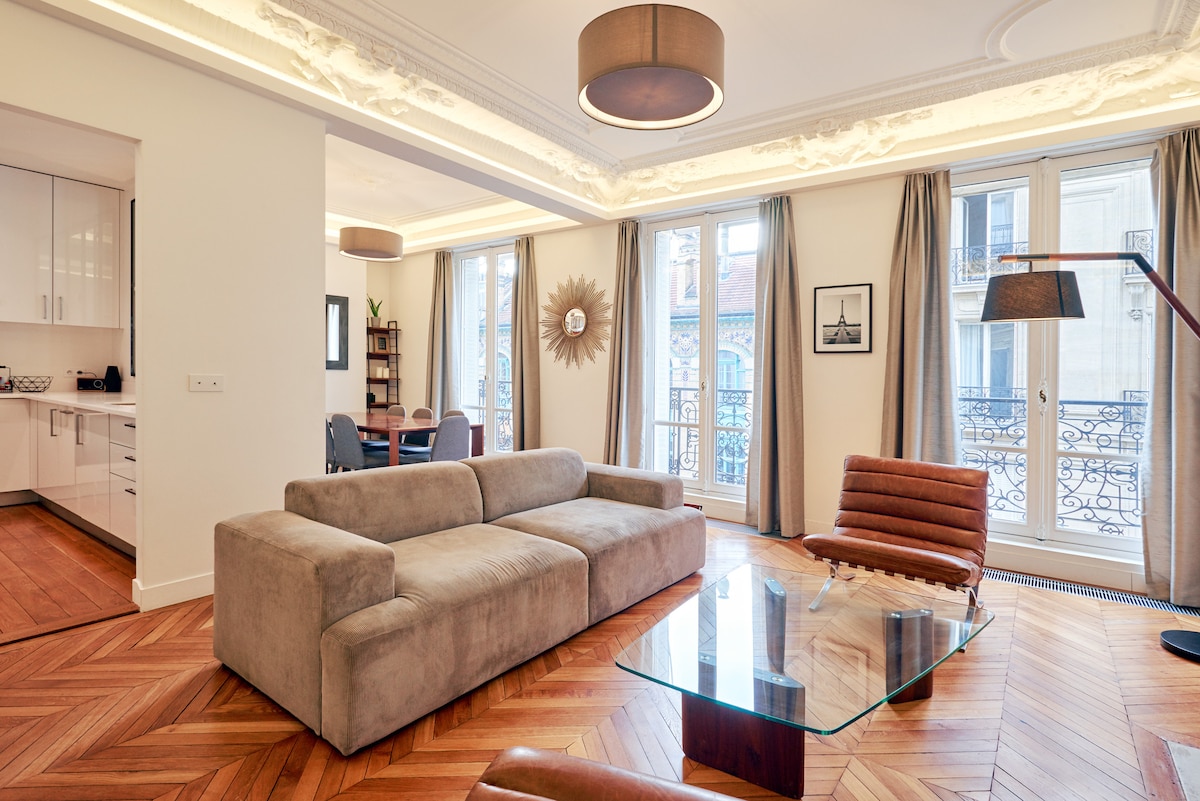 Just a minute from the Champs-Élysées, this luxurious two-bedroom apartment is a true Parisian gem. Designed by architects, it combines noble materials—marble, Versailles parquet, sculpted ceilings—with modern comfort. Each bedroom has its own private space, and the bright living areas create an elegant, welcoming atmosphere. Enjoy the prestige of Paris in this unique apartment, set in an iconic neighborhood.
