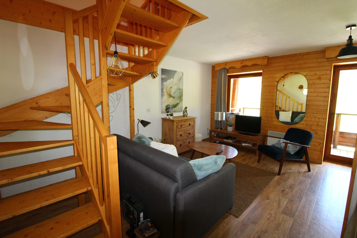 Dans une résidence idéalement situé, à 50m des remontées mécaniques, des commerces et restaurants. Appartement cosy de 40 m2, vue sur les pistes, situé au 2ème et dernier étage avec ascenseur. Duplex rénové. Au rdc, belle pièce de vie avec coin salon, canapé convertible, cuisine équipée (lave vaisselle) et salle d'eau. Balcon terrasse avec table et transats. A l'étage une chambre avec rangements et une salle de bain avec baignoire. Petit balcon. Charme des poutres et du bois, chaleureux.