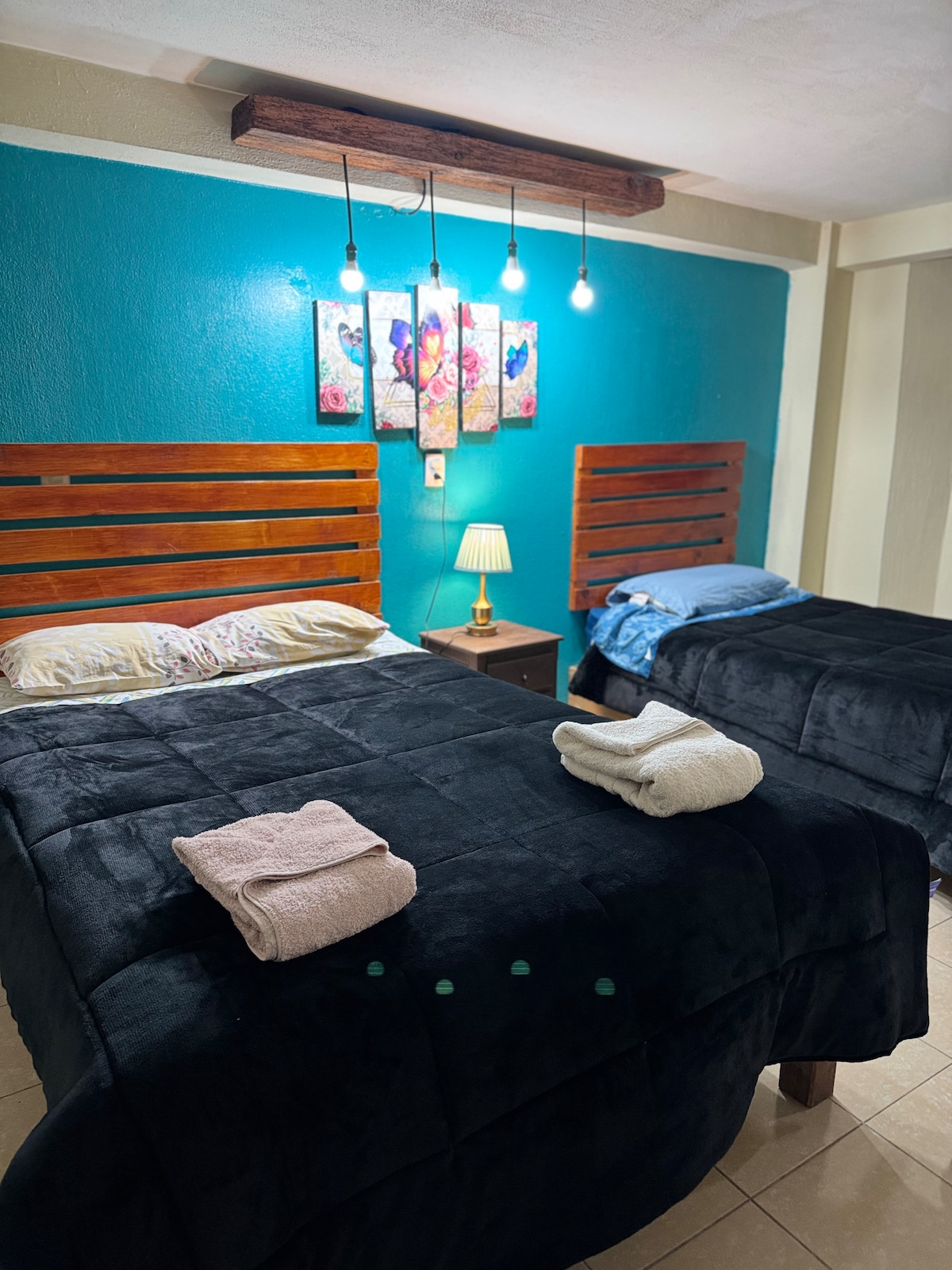 Departamento pequeño, seguro, tranquilo, en planta baja, a 2 calles de la plaza Catedral, en el centro histórico de San Cristóbal de las Casas, desde el cual podrás dirigirte caminando a los principales puntos de la ciudad, cuenta con una cocina-comedor, 1 medio baño, refrigerador, horno de microondas, agua, cafetera y trastes, recamara1 (2 camas= 1 matrimonial y 1 individual, tv con cable, baño completo dentro); 2o.recamara (cama matrimonial y baño con regadera, tv con cable), Wifi estable