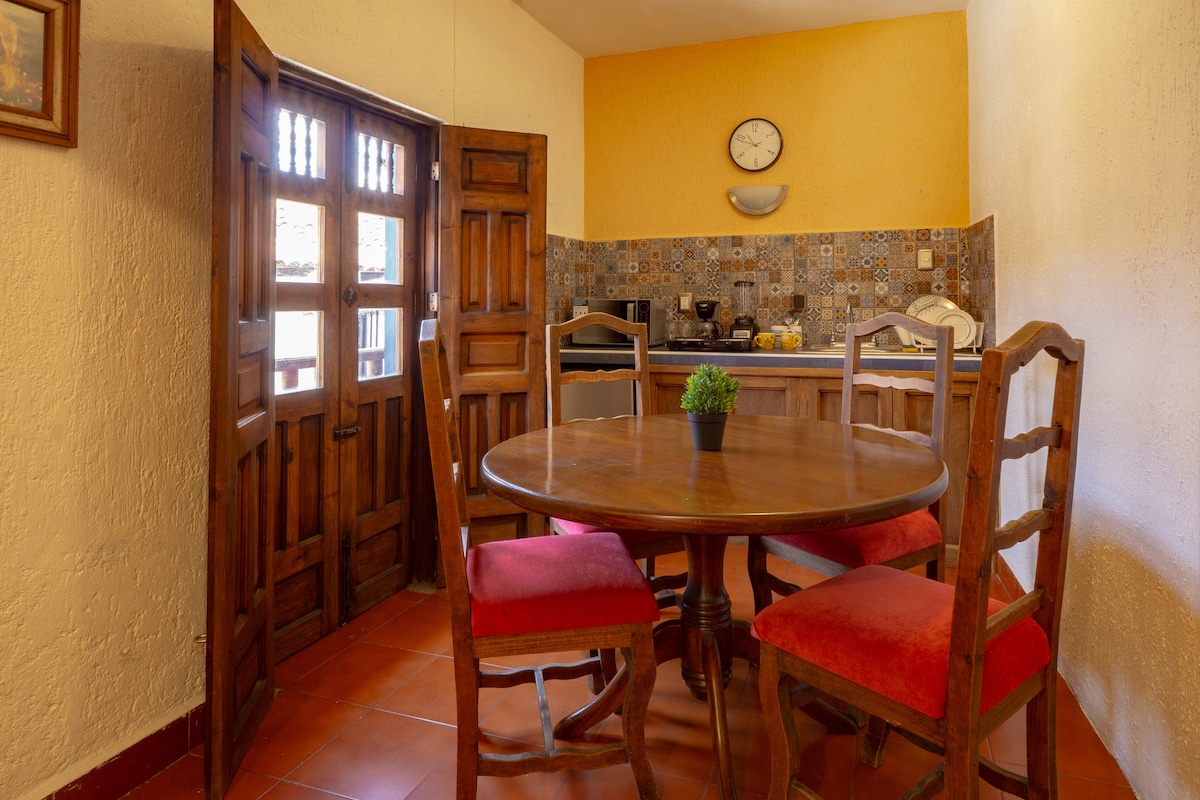 Between the main plaza and the biggest artesanal market, on a quiet street in the heart of San Cristobal, our "Bolom" suite is private, spacious, and in which you'll enjoy having your own terrace, kichenette and bathroom with a hot shower. It's perfect for a cozy romantic get away, or for a longer stay, the dining area can also be used as a workspace. You're free to enjoy our common areas which include a colonial courtyard and a beautiful terrace with incredible views of the city and sunsets.