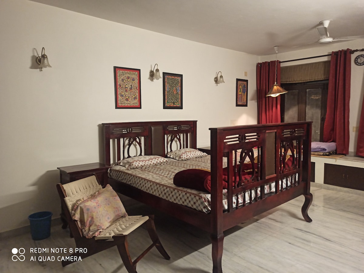 Do you want to bond with family, friends or colleagues in the lap of nature in New Delhi? Do you wish to experience the ideal blend of old-world charm and hospitality with all modern amenities? Do you desire to take a stroll in sprawling lawns under fruit trees or lie in wait for peacocks? If YES then this independent 3-bedroom apartment of Shiv Niwas villa, with private balconies & roof terrace, smart locks, property-wide high-speed Wi-Fi, free car parking & caring lady caretaker-cooks BECKONS!