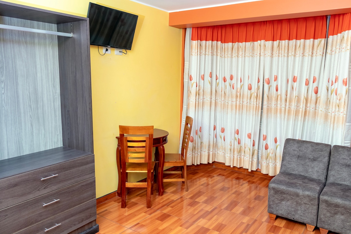 Hotel Liberata ubicado en San Ramón, Chanchamayo te ofrece una amplia habitación matrimonial con vista panorámica al río Tulumayo. Cuenta con los servicios de Wifi, Smart TV, cable, agua caliente y cochera techada.
