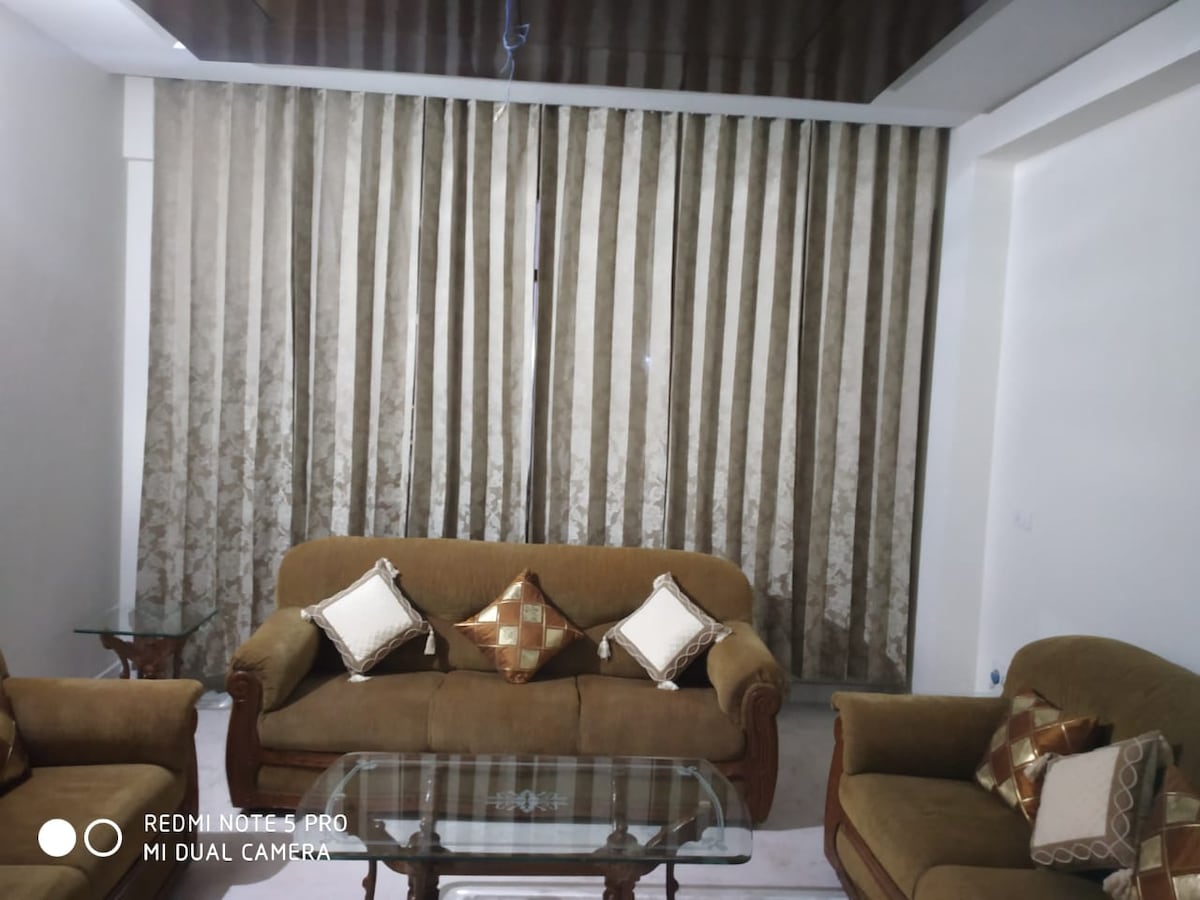 It is located at a beautiful location surrounded by greenery. It provides a homely environment with all modern facilities and ample parking space for your vehicle with high security. The property is built in a large peaceful area and one can enjoy sitting outdoors too and inhale some fresh air. Guests have complete access for sitting outdoors at the property where there is a gazebo hut to chill and relax. The chirping of birds and very frequent gathering of peacocks makes it even more pleasant.
