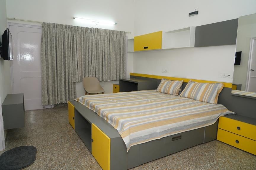 Welcome to a cozy retreat atop a spacious house in the heart of Chandigarh! This private, one-room studio offers a unique rooftop experience with an attached bathroom and a kitchenette. Situated on the 2nd floor, the space is perfect for solo travelers, couples, or business guests seeking comfort and convenience. Our central location makes it easy to explore the best of Chandigarh & the rooftop setting gives the space a serene, airy vibe, perfect for unwinding after a busy day.