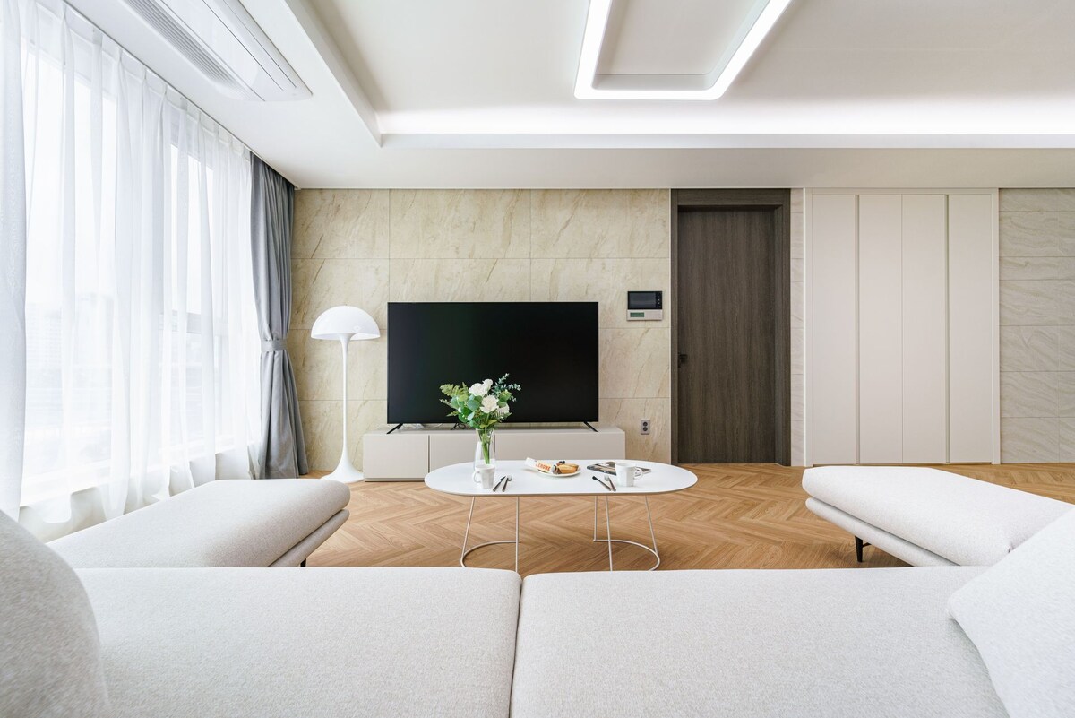 🌸 스테이예하 ‘예하’는 순수 한국어로 풀어낸 '예쁘게 하다, 아름답게 품다' 라는 뜻을 담고 있습니다. 여행을 특별한 순간으로 만드는 집이 바로. 스테이예하입니다. 🎉 Grand Opening Special Offer 🥂 📍4박이상: 공항 픽업 무료 서비스 📍6박이상 : 공항 픽업/ 샌딩 무료 서비스 (1대기준 , 2대시 추가요금 발생) ✨ 숙소 특징 부산역에서 도보로 4분이면 도착 50평 프리미엄 복층 단독 하우스 방 3개 · 거실 2개 · 욕실 2개 · 주방 2개 퀸사이즈 침대 7개 (호텔식 침구 제공) 🚶♀️ 4층, 엘리베이터 없음 (넓고 완만한 계단) 각 층 25평 규모, → 모두가 함께 할 수 있는 넓은 거실, 필요할 땐 층별로 나뉘어 프라이버시와 편안한 쉼 보장 각층 프리미엄 침실 + 거실 + 주방 + 욕실 완비 Mid-century 디자인 + 키치한 오브제 + 갤러리 감각이 공존하는 유니크한 무드, 감성 감성 프리미엄 스테이
