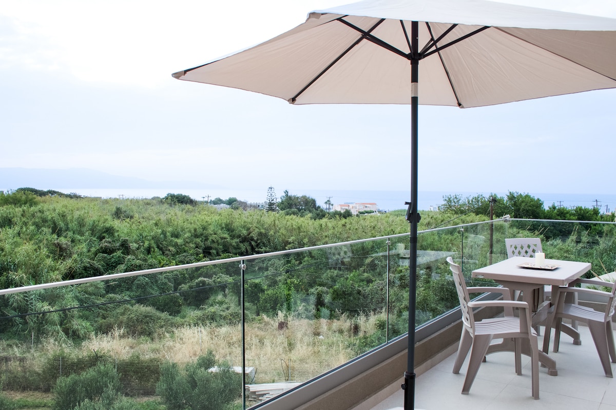 Vacations in Crete? Spoil yourselves with a luxurious villa with a large seaview-terrace! 3 seperate bedrooms, each with insuite bathroom, fully equipped kitchen-joyful moments at our jacuzzipool. Located in the most beautiful area-the Golden Beach, a minute's walk to the sea & 3 km from the center of Chania. Supermarkets, restaurants, ATM, taxi, bus stop nearby. The area offers 4 beaches, fully organized-awarded yearly. 5 minutes away there is a small park for jogging, offering free playground.