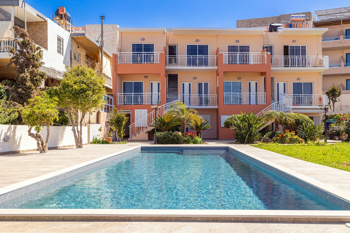 Experience ultimate comfort and convenience at this inviting Agia Marina apartment. Situated on the P.E.O. Chania – Kissamos road, you're 1 minute walk to the stunning Agia Marina beach. Enjoy a refreshing private pool. The bus stop is incredibly close (20 meters away) for easy transportation. Enjoy spacious interiors and a large garden. Includes free Wi-Fi, powerful AC, a well-equipped small kitchen, TV, and hairdryer. Chania is just a 10-minute drive.