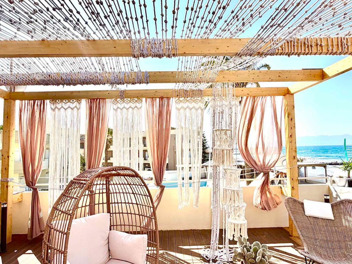 Every room has an unobstructed sea view. The terrace is fully private — just you and the ocean. Below, a natural stone pool carved by the sea, with a freshwater shower beside it. No crowds, no vendors — locals swim here at sunrise. Quiet, safe neighbourhood. Few min to bakery & shops around, 15 min to Chania Old Town. Free parking at the door. Beach bags, towels & welcome basket included. Green Pass certified electricity. Superhosts for 4 years. Self check-in. Celebrating something? Tell us.