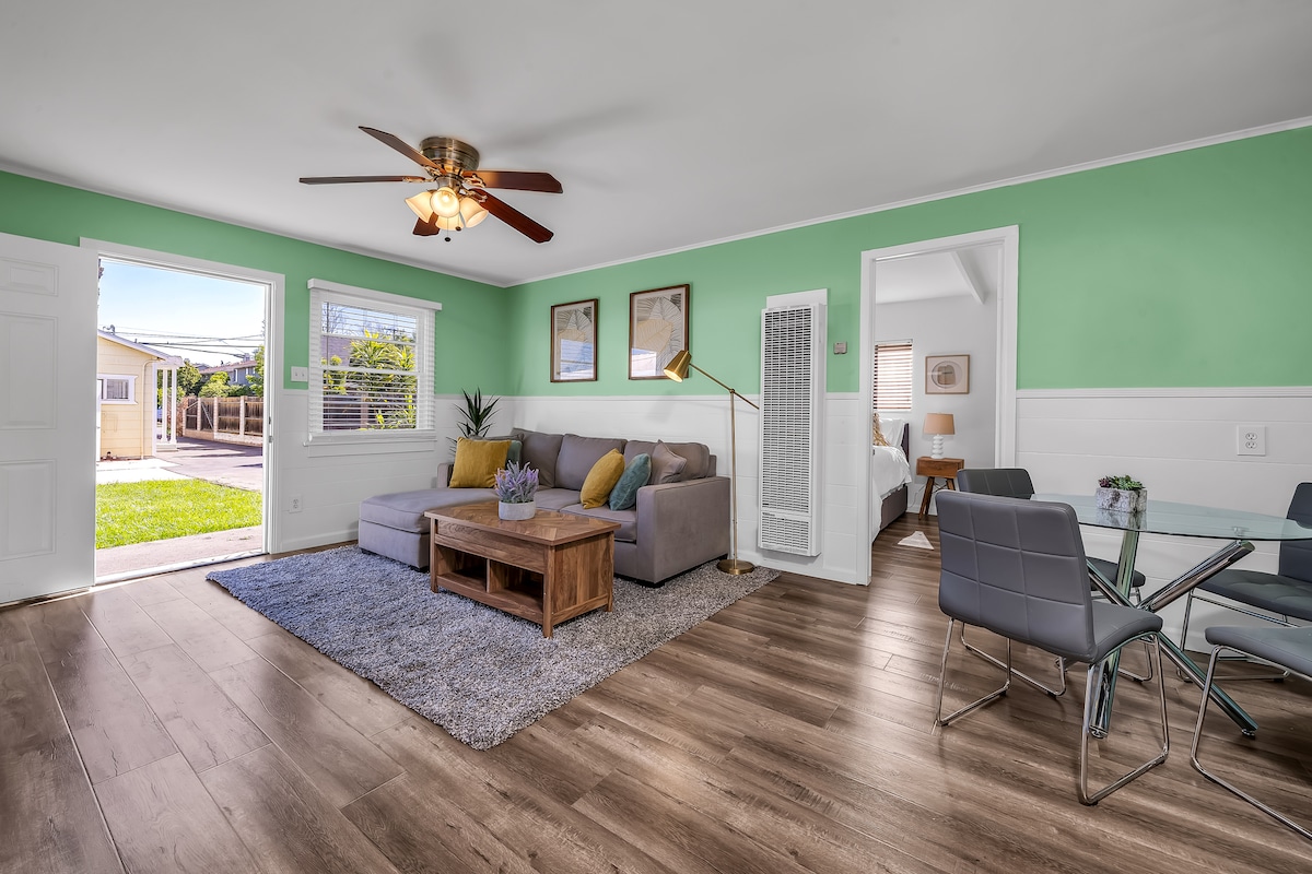 Featured in Remodelista, the Blush House is a design dream—skylit, with rose-gold fixtures, modern decor, and plentiful lounging space, it's fully-stocked with essentials and extras for a heavenly California stay. Catch rays or a meal on the wood deck. The light-drenched living room, picture-perfect blush kitchen, and eat-in nook are also central gems. Relax on the sofa with endless SmartTV options, or work (if you must!) at the gorgeous built-in desk. Easy, free parking on a safe street.