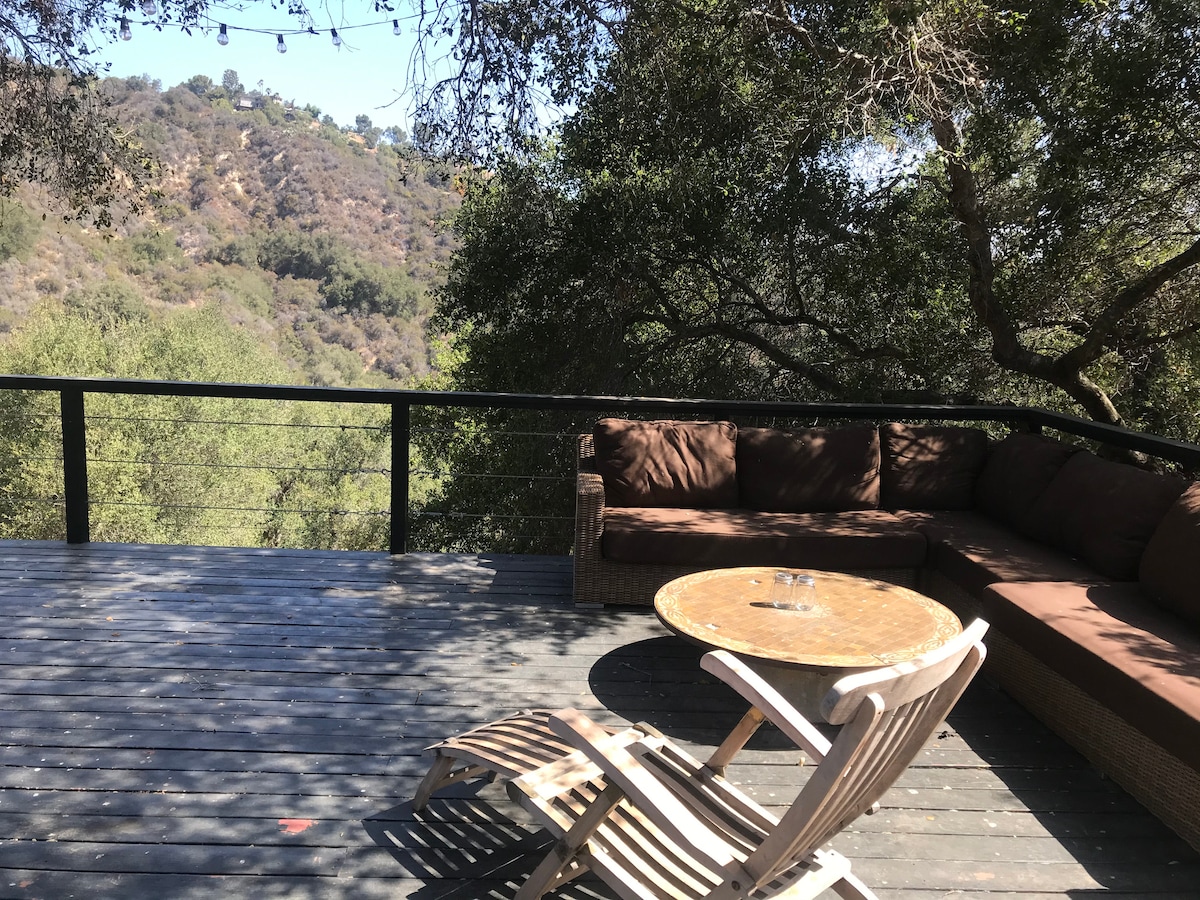 Professionally cleaned and sanitized. Perfect for the business traveler! Private hillside home rebuilt as a design showcase w/sweeping views of mountains, palm trees and downtown skyscrapers. Every detail carefully considered for a peaceful stay. Very safe, with secured gate to enter the property. Convenient location in the heart of LA, easy to access but secluded in a quiet neighborhood near wilderness park. 1400 sq ft+outdoor view deck. (Please read house rules prior to booking)
