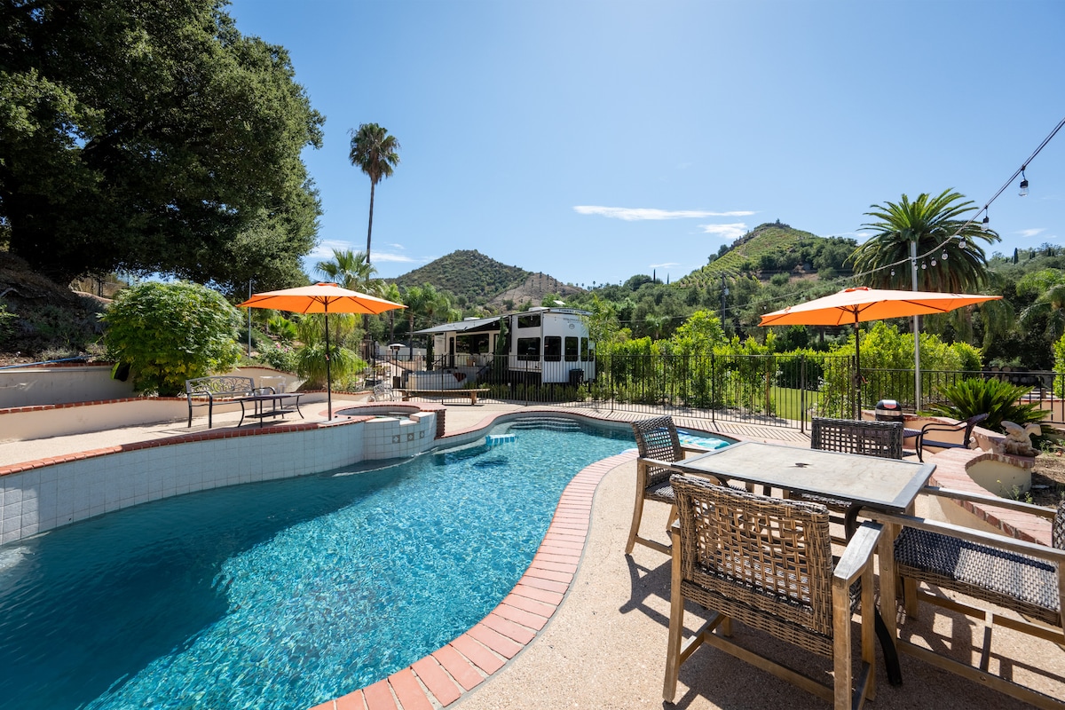 房源内有Winnebago房车,配备泳池/热水浴缸/特斯拉充电桩