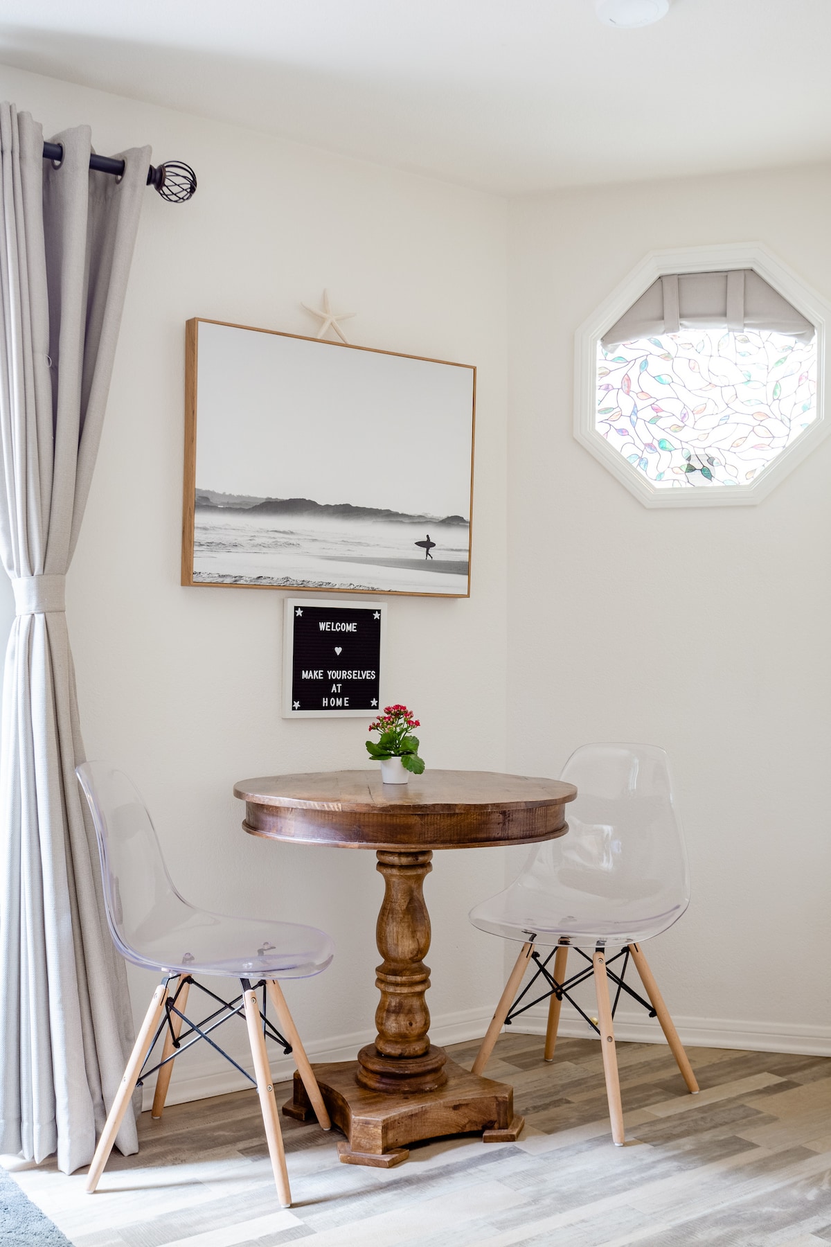 Rafter ceilings, coastal farmhouse furniture, and a white-washed, sandy color palette bring the tropical vibes inside. Families can take toys to the beach to play by the shore. Located on the second floor and includes one car garage parking spot. The bungalow is a block away from Corona Del Mar Beach in the "Flower Streets," surrounded by multimillion dollar homes. CDM Village—known for quaint shops, café’s, bakeries, and restaurants—is just around the corner. Disneyland is 20 miles away.