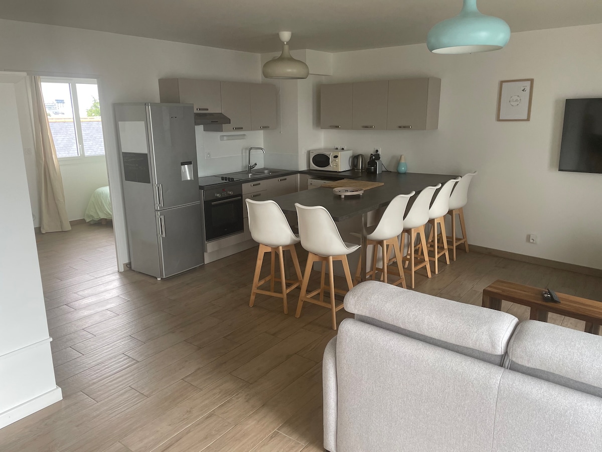 🎯 Rennes city center. 🚶🏻♂️ 3 min walk to bars and restaurants. ❤️ Perfect for a couple's experience. 📐 50m² with Living room + Bedroom + Kitchen. 🚘 Free private parking space. 🖥 High-speed fiber internet. 🖼️ Panoramic view of the city center. 🍜 Fully equipped kitchen, shower room. 🛋️ Living room with sofa, 4K TV, Netflix, YouTube. 👮♂️ 24-hour security in the building.