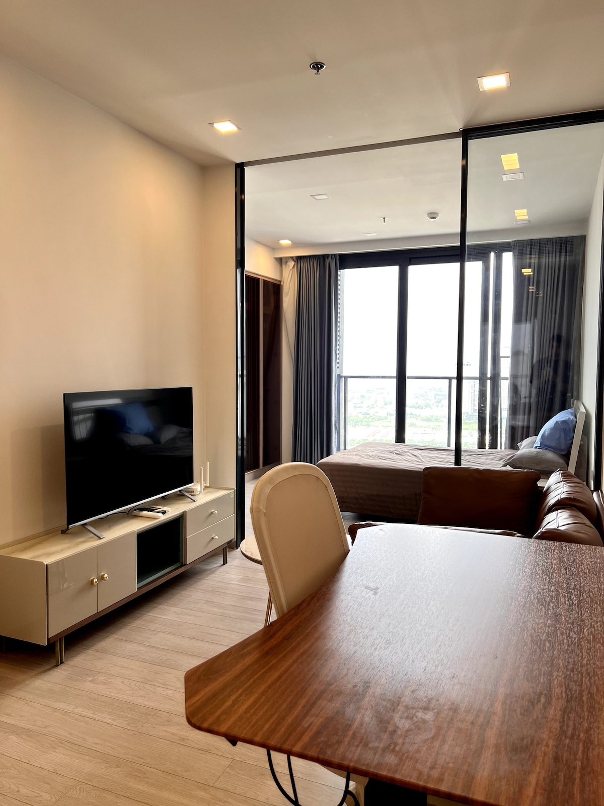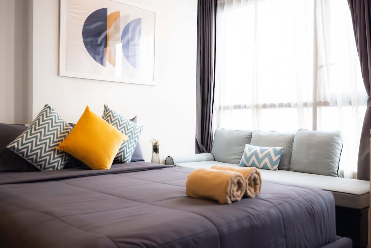 Welcome to your cozy urban retreat! This modern classy apartment offers the perfect blend of comfort and convenience. Chill out in the living room or bedroom, or cook up a storm in a fully equipped kitchen with an electric stove and microwave. With TV for entertainment and gorgeous views of the city skyline , it is our hope that you will feel utmost comfortable. Enjoy easy access to building amenities with the On Nut BTS and major shopping hubs like Tesco Lotus and Big C nearby.