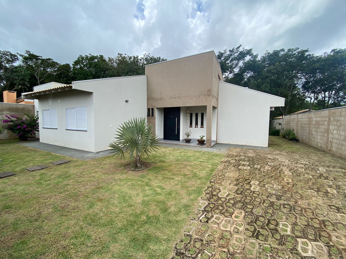 Casa Samambaia: - segura: muro e portão c/ controle. - ampla: 600m de área, 4 qts, 3 wc, jardim e quintal. - confortável: ventiladores teto, AC, Wi-fi, Smart TVs, chuveiro quente, camas king/queen. - gourmet: churrasqueira, fogão lenha e freezer. - lazer: parquinho, pista caminhada e cachoeira próxima. - conveniência: 800m mercado/restaurante; 500m da rodovia; 3 km da Praça Central. ***************** - Checkin > 14h / Checkout > 11h; - Reservas sob consulta. - Enxoval (2+ diárias)