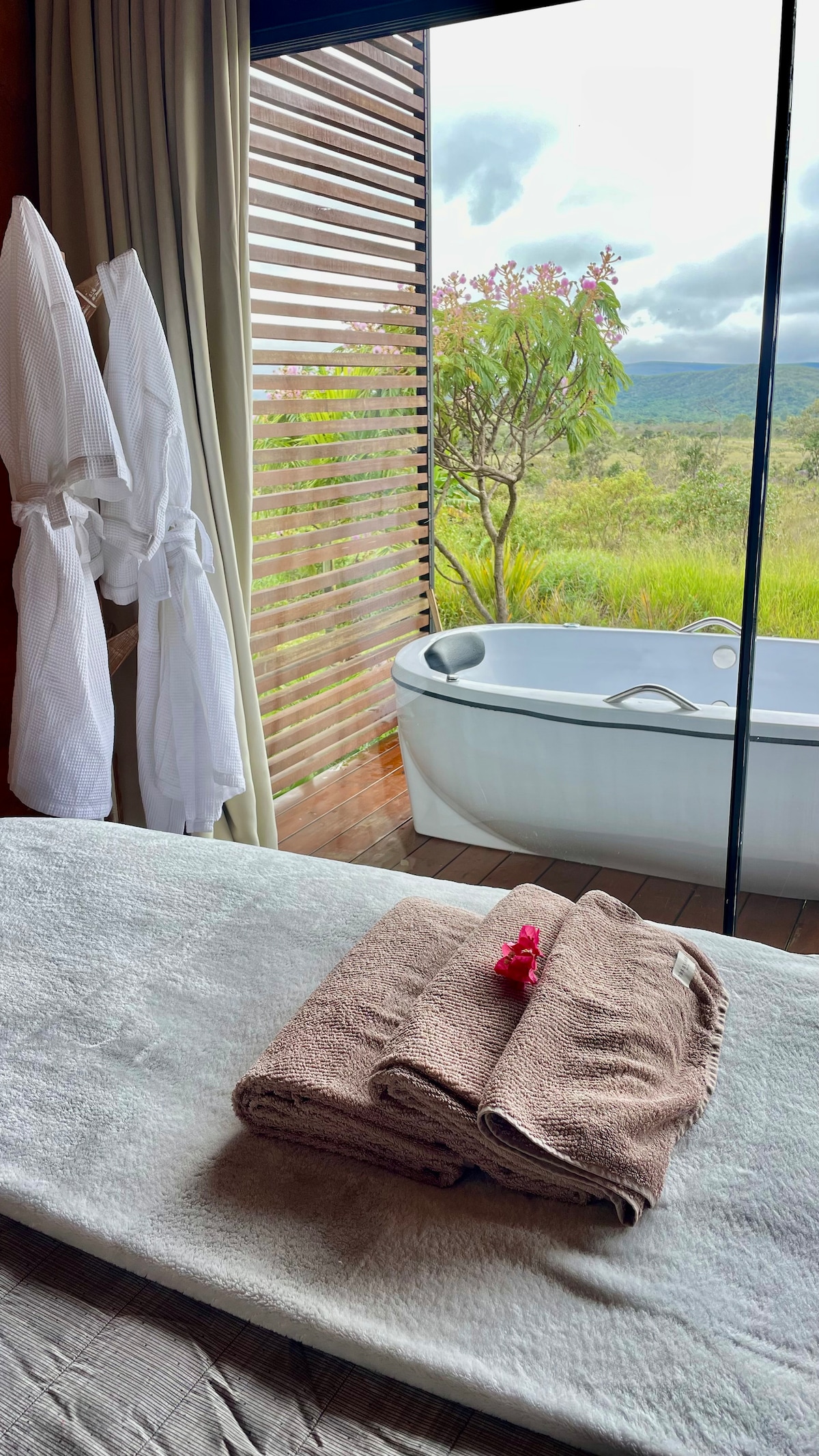 Integrante da romântica Villa Pouso Alto, a Gruta possui um espaço muito amplo (100m2 de área interna+varanda) e confortável para casal com uma vista ímpar das montanhas. Sua arquitetura mistura o rústico da chapada com sofisticação e modernidade, o que torna a estadia muito agradável e com muito conforto. Possui hidro, deck coberto, ar condicionado, TV 65", sound tower, piscina aquecida compartilhada com vista encantadora *CAFÉ DA MANHA OPCIONAL pago à parte. AGENDE na reserva
