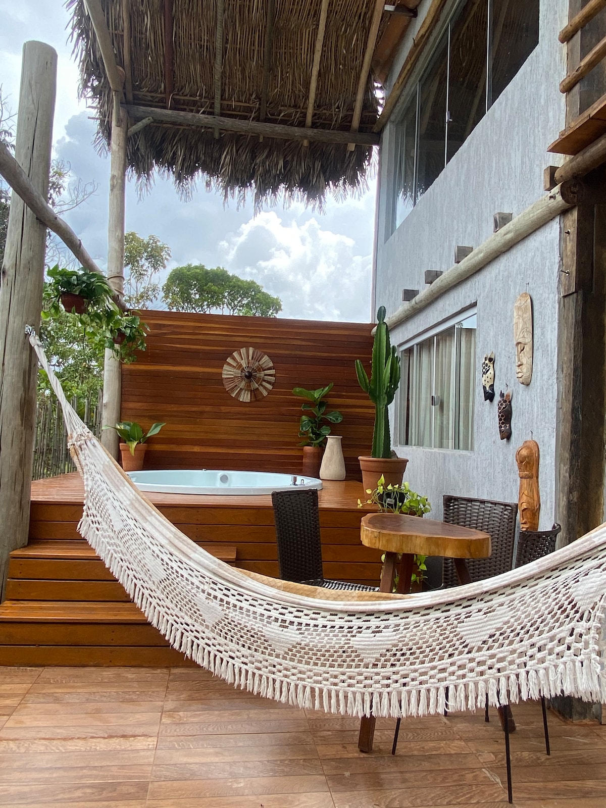 Pure luxury on two floors with fine finishes, king bed and a beautiful bathtub. A veranda with a hammock with direct views of the waterfall and an untouched São Miguel valley. On the ground floor there is a large living room, work table, kitchen and spacious second bathroom and a double sofa bed. Pure spring water in every faucet, amazing views from the windows. Outside a trail leads straight to the meeting of rivers and private waterfall, surrounded by thousands of hectares of pristine Cerrado.