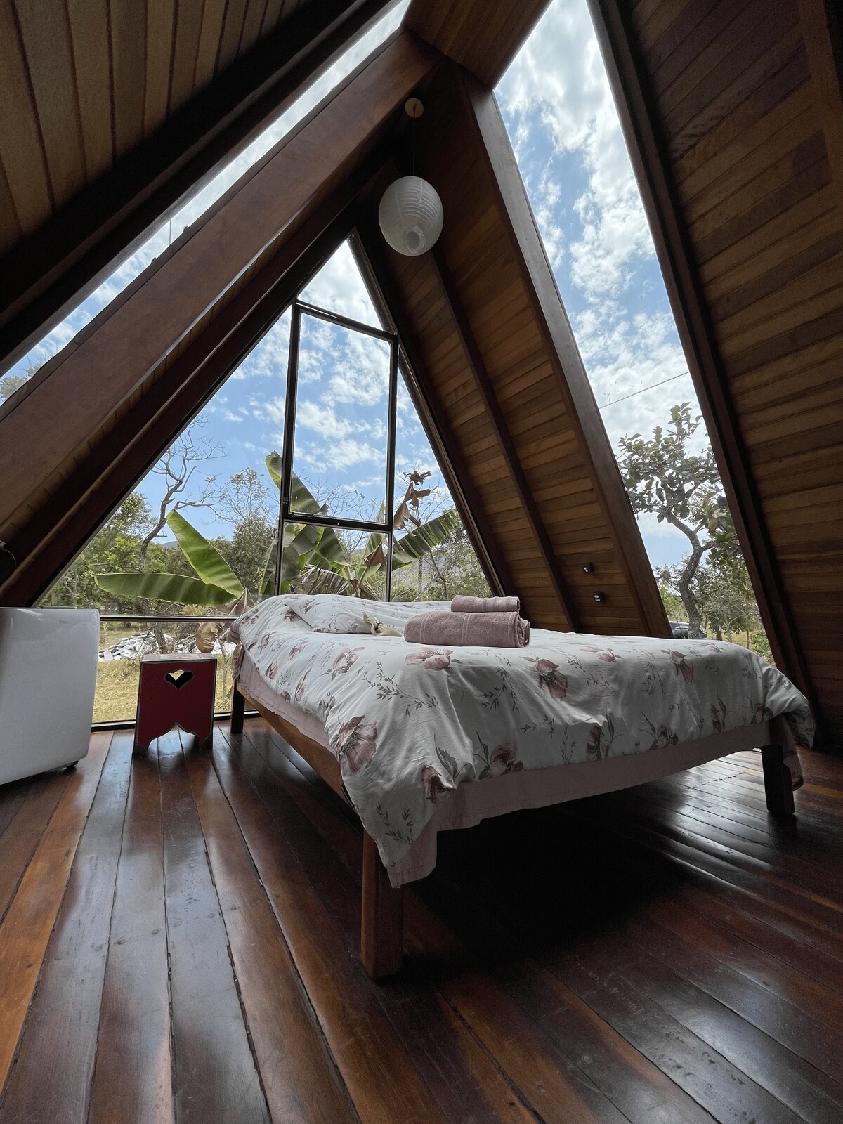 A cabana Átria é um refúgio romântico com vista cinematográfica para as montanhas da Chapada dos Veadeiros. Da hidro ou da varanda, admire a Serra da Boa Vista e o pôr do sol inesquecível. A poucos minutos do Parque Nacional e das principais cachoeiras, a Átria é o lugar perfeito para desacelerar e viver a magia da Chapada. Aqui, o tempo desacelera. O sol nasce entre as montanhas, o silêncio é profundo e as noites são banhadas por um céu estrelado — um convite para viver a Chapada de forma única