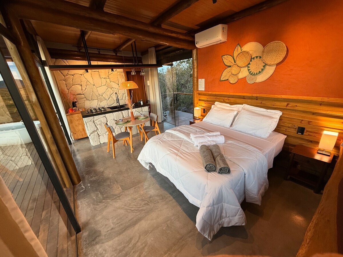 A cozy and refined chalet with a mezzanine, fine finishes and a kingsize bed. On the ground floor there is a large living room, work desk, kitchen and living room and a beautiful and spacious bathroom, with a double sofa bed. It has a balcony with a beautiful view and an outdoor shower. Pure spring water in every faucet, amazing views from the windows. Outside a trail leads straight to a private waterfall All this in the midst of thousands of hectares of untouched Cerrado and rich wildlife.