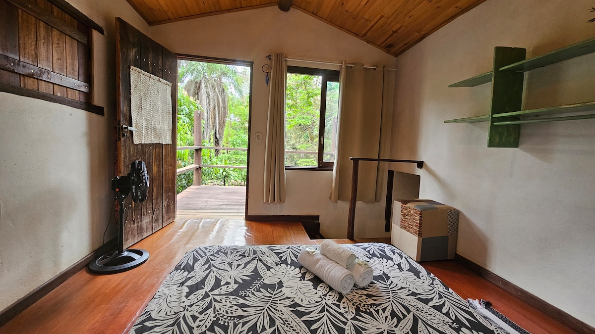 A cozy and refined chalet with a mezzanine, fine finishes and a kingsize bed. On the ground floor there is a large living room, work desk, kitchen and living room and a beautiful and spacious bathroom, with a double sofa bed. It has a balcony with a beautiful view and an outdoor shower. Pure spring water in every faucet, amazing views from the windows. Outside a trail leads straight to a private waterfall All this in the midst of thousands of hectares of untouched Cerrado and rich wildlife.