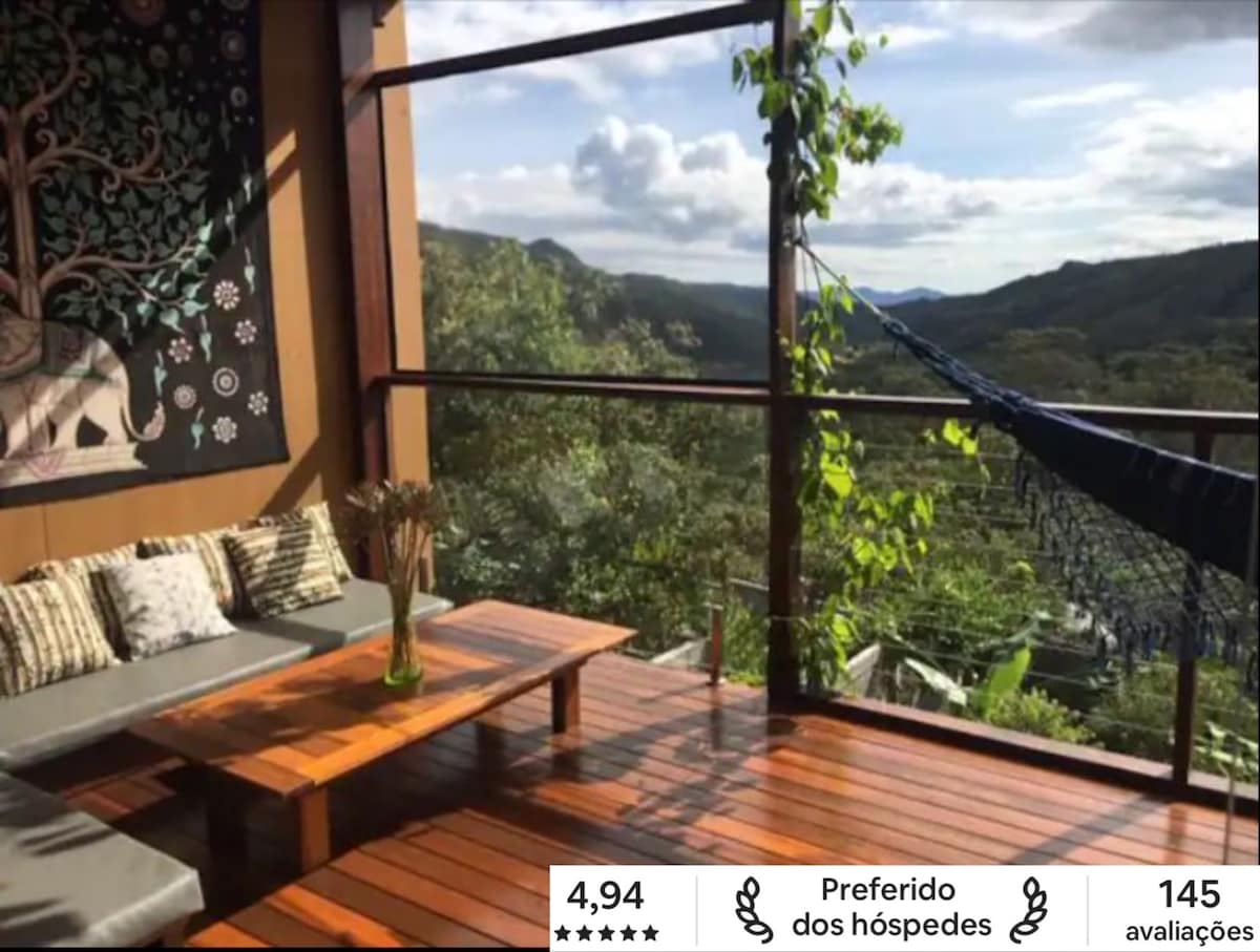 Bem vindos a nossa casa nas montanhas junto ao luxo da natureza, a magia da paisagem, o ar aconchegante a mata nativa tornam este local perfeito para descansar, contemplar a natureza e os pássaros que nos visitam. Bem iluminada e arejada, a casa tem um jardim de inverno que cria dois ambientes internos em conjunto com a natureza. Você vai chegar e sentir a paz e o silêncio que esse lugar proporciona. .600m da Avenida Principal de Alto Paraíso .Design diferenciado, planejada com Feng Shui