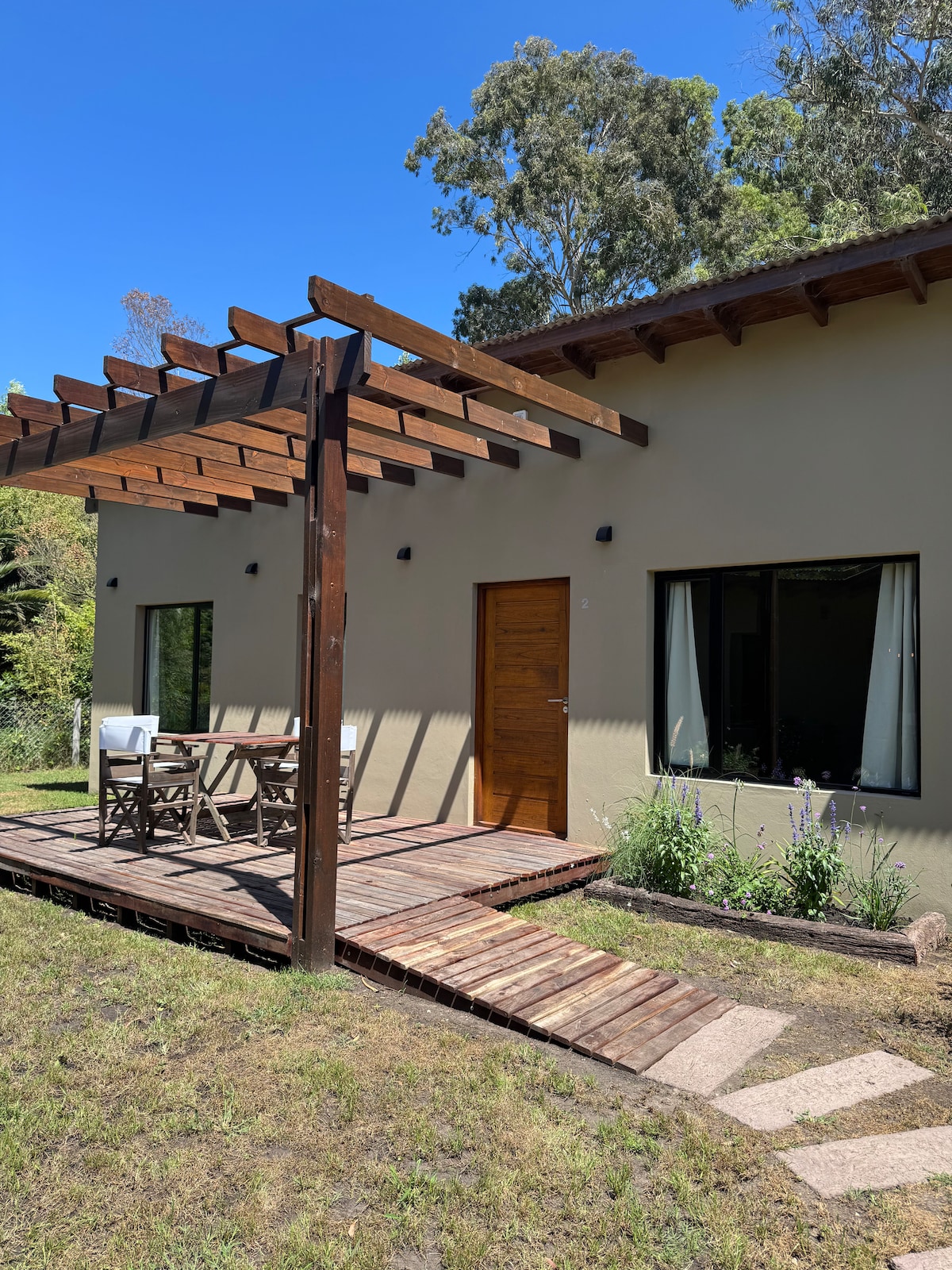 Vivi el campo y el mar a 400 metros de la playa Cruz del Sur. Disfrutá de un entorno natural y relajante. Se trata de una casa que construimos para disfrutar en familia y que decidimos alquilar en épocas de año en las que no la usamos. Pueden alojarse hasta 4 personas. Posee un dormitorio principal y un segundo dormitorio integrado al living (sin pared divisoria). Tiene dos camas matrimoniales que se pueden transformar en 4 singles.