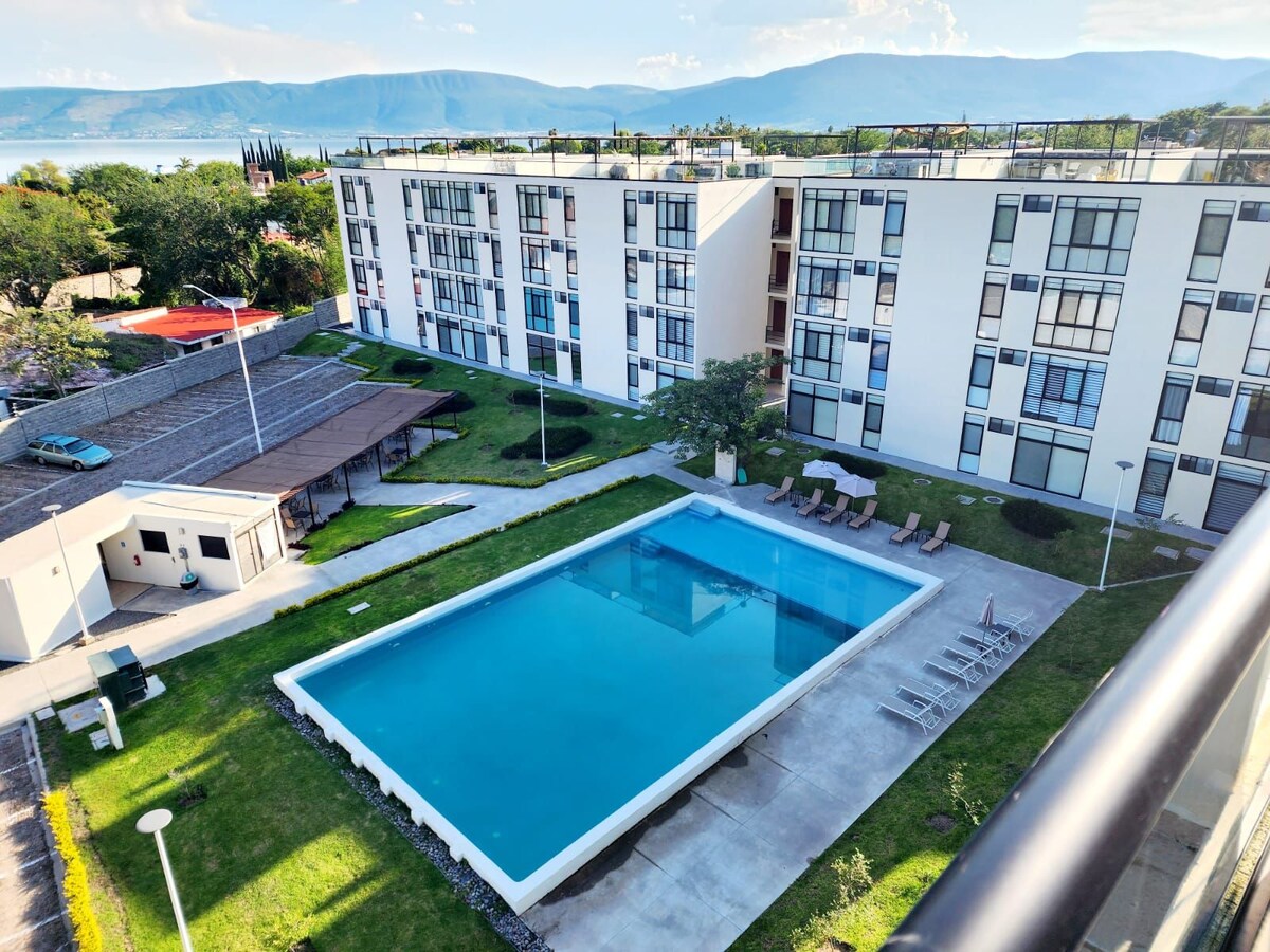 Estrena bonito departamento junto al lago de Chapala. Dentro de un condominio con alberca, áreas verdes y tranquilidad. Wifi, Smart TV, cocina equipada, refrigerador, utensilios, vajilla y todo lo necesario para una escapada en pareja.