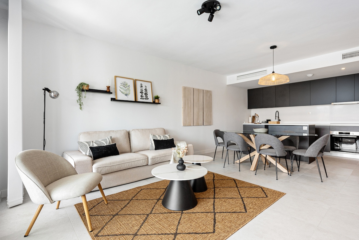 Enjoy your stay in this stylish 2-bedroom, 2-bathroom apartment located in a vibrant community just a 10-minute walk from the beach. The complex offers fantastic amenities including pools, a spa, gym, and co-working space. Perfectly situated just 5 minutes from both La Cala de Mijas and Fuengirola, and only 25 minutes to Marbella and Málaga Airport. Surrounded by top golf courses and coastal attractions — the ideal base to explore the Costa del Sol! Please note: Parking in front of complex