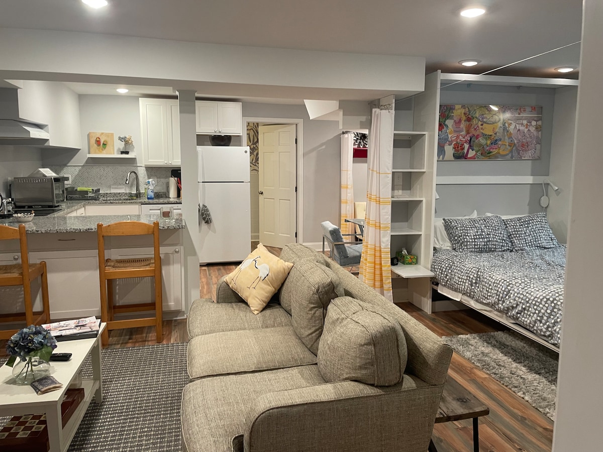 Take it easy on the swing seat on the wraparound porch at a luminous 2 bedroom abode in downtown Carrboro. A soothing mocha color palette blends with cool mint, a light wood kitchen, and quartz countertops to create a cozy, contemporary space. Your private entrance to this Carrboro Mill House is the front door on the wrap-around porch, steps from two dedicated parking spaces. Enjoy the weather and the outdoors sitting on the porch. Walk inside to a small downstairs foyer with a coat rack and space for your shoes. The washer/dryer is also downstairs to keep the noise away from the living area. Walk upstairs into the living and kitchen area with all new furniture and fixtures. You’ll notice that there is no door at the top of the stairs, which is one example of why we do not accept young children. The living area seats five comfortably, however only four may sleep at Stone’s Throw. Read, nap, work, watch cable or Apple TV (if you are so equipped) in the living area. The kitchen is fully equipped, with marble countertops and smaller European appliances. Basic spices and other essentials are stocked. The shower/bath is large enough for a relaxing soak, and has a large shower head. Press the small square outline on the lower right side of the mirror and the white backlight turns on, again and the blue light turns on, as shown in the picture. The master bedroom is equipped with a king sized bed, reading lights, USB ports on both nightstands, and a walk in closet. The bed is better than hotel luxury. The second bedroom has a queen bed, a small desk and storage area, also with reading lights and USB ports. Full access to the apartment and porch. We have lived in the area for many years, and are happy to answer your questions! We want you to enjoy your stay and can point you in the right direction. Check-in is self-service making it flexible for you. This quiet residential road is a Stone's Throw from Open Eye Cafe and 1 block south of Main Street and Old Greensboro, Carrboro's city center. Ideally located, restaurants, bars, groceries, pharmacies, the Cat's Cradle and Weaver Street Market are within a two block stroll of Stone's Throw. Walk to the Saturday Farmer's Market, food trucks, casual and fine dining. Connect to the bike path one block away. Catch a free city bus just steps from the front porch. Depending upon your plans, you may or may not need a car. Walking, biking and the free bus system are how a lot of locals get around in Carrboro and downtown Chapel Hill. Lyft and Uber are readily available. You have two reserved parking spaces, which is a definite plus in this area. There are stairs from the downstairs foyer to the full apartment. If you are unsure on stairs, please note that the treads may feel short and the rise may feel steep.