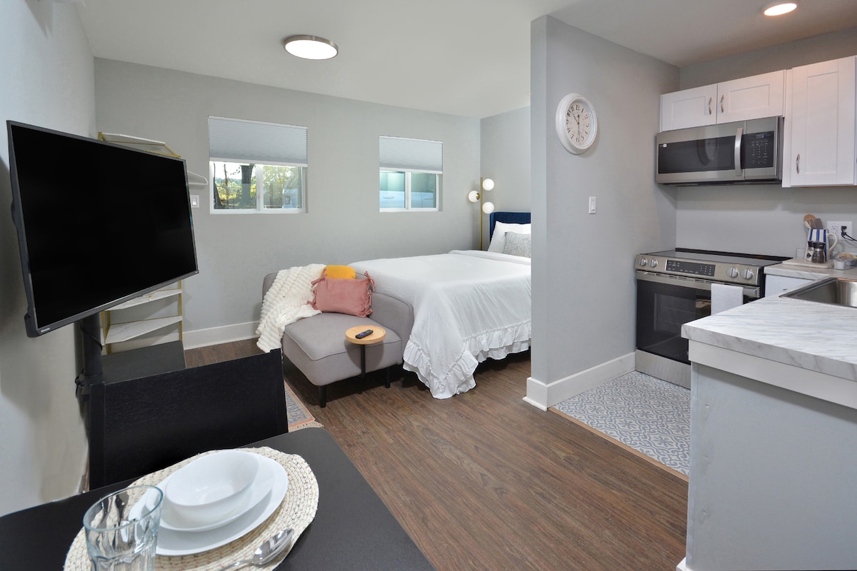 别致公寓,加大双人床,77英寸电视,可携带宠物,靠近RTP Hub