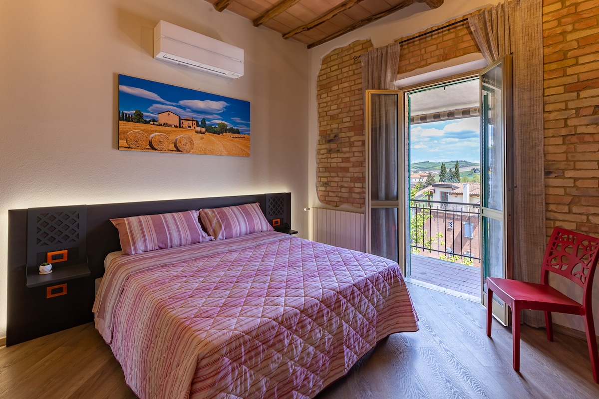 Alma Vignoni is an elegant and exclusive holiday house in Vignoni Alto that recalls Tuscan style and is enriched by unusual and personal details. The house consists of an open-space with fireplace in the center. On the one hand the room with stunning views over the surrounding hills (Pienza, Monticchiello and Montepulciano) on the other the kitchen area. Two cozy rooms overlook the ancient Via Francigena and the Orcia river valley. The bathroom has a large shower.