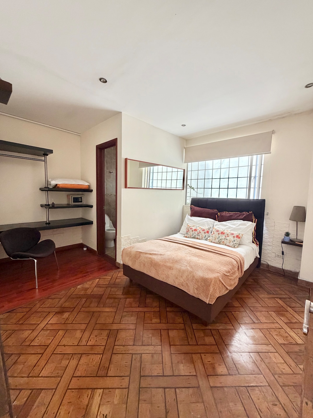 Our comfortable one bedroom apart-studio, interior location with windows towards a garage, and to a courtyard, bohemian, minimalist, with a small garden has a true city feeling! It comfortably accommodates four people and it´s centrally located on a street, with easy access to Simon Bolivar Metropolitan Park. Enjoy a complete kitchen, and access to Transmilenio. This space is ideal for two people; however, we provide a high quality sofa bed for two more people should the need arise. Hot water