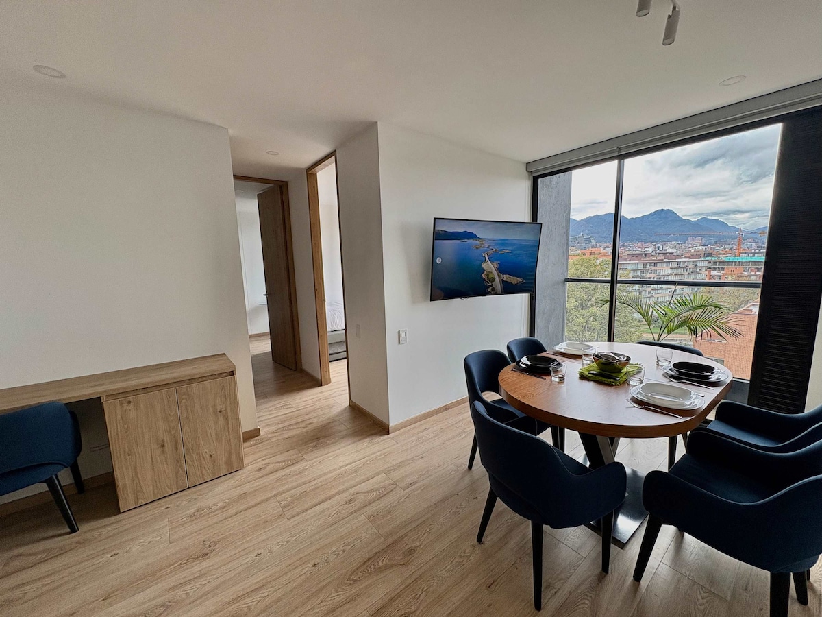 Apartamento de lujo de 74m2 con todos los servicios. Desayuno servido al apartamento, gimnasio, piscina-jacuzzi en la terraza del edificio, préstamo de bicicletas y salas de reuniones, recepción las 24 horas. Ubicado frente al parque el Virrey una de las mejores zonas de la ciudad a tan solo 5 minutos de la zona T donde podrá encontrar exclusivos restaurantes, bares, bancos, supermercados, la clínica el Country, la calle de los diseñadores, centros comerciales como el Andino.