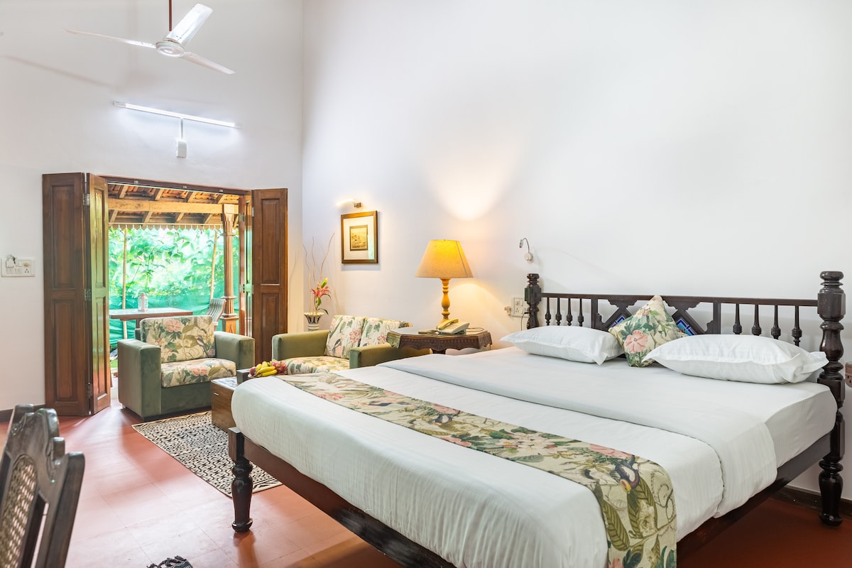 Embraced by the breath taking beauty of tropical landscapes, our air-conditioned rooms radiate elegance, showcasing antique wooden furnishings, plush woven carpets, and remarkable craftsmanship. The room features a magnificent 150-175- year-old antique king bed and wardrobe, providing a cozy retreat for two adults, with the option to add an extra bed for enhanced comfort. Delight in your own private sitting area, beautifully appointed with a luxurious sofa set etc..