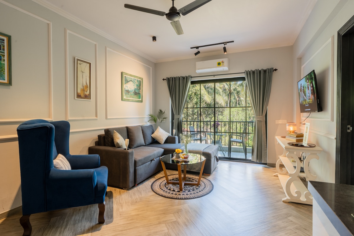 Modern Boho Apartment | Minutes from North Goa's Beaches.A cosy, fully furnished 1BHK retreat perfect for couples, friends, or small families. Highlights: - Stylish boho interiors with a warm vibe - AC in bedroom & living room for comfort - Smart TV + High-speed WiFi - Equipped kitchen with RO water, cooktop, fridge & washing machine - Shared swimming pool (9 AM–6 PM | swimwear mandatory - On-site gym available as a paid facility - 24/7 security for peace of mind - Free Parking