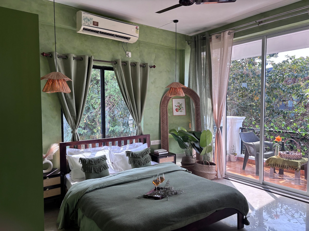 Tropical 3BHK Home | Lush Green Surroundings Relax in this beautifully designed 3BHK apartment in Goa with calming green interiors and a warm tropical vibe. The home features three spacious bedrooms, air-conditioning, stylish lighting and large windows with ample natural light. Enjoy your private balcony with partial sea view, overlooking lush greenery and the iconic Chapora Fort. Perfect for peaceful mornings. Ideal for families, friends and long stays in North Goa.