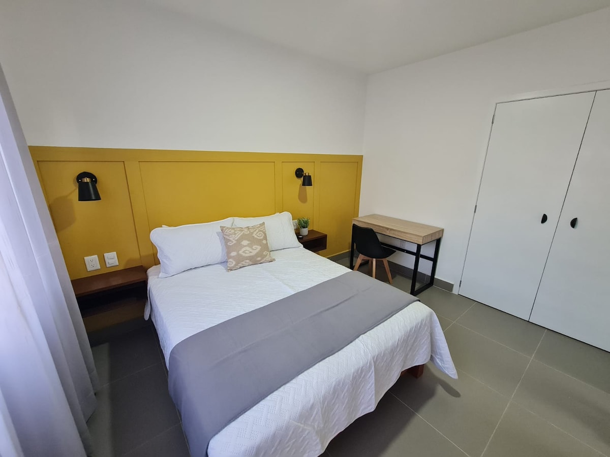 ★"The place exceeded every expectation, it was clean and stylish" ✭ Free welcome relaxing massage (15 mins) → Walk Score 85 (Groceries, restaurants, cafés, bars, museums) → 1 minute walking to Guadalajara's downtown → Fulled equipped + stocked kitchen → Safe neighborhood → USB charging port in walls Soft Double bed. two Hypoallergenic pillows. Remember, your home away from home (: 40 min drive to Guadalajara Airport