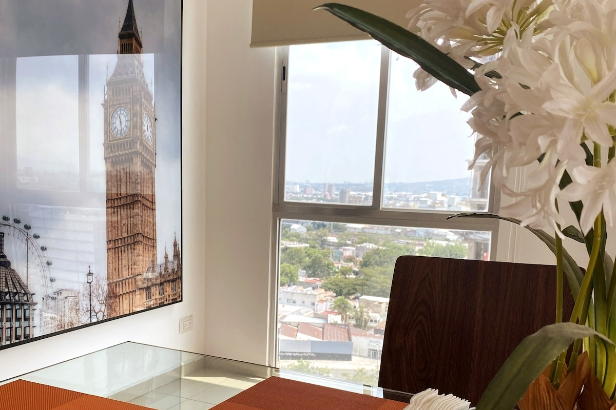 - Acogedor y exclusivo estudio ejecutivo con cama queen-size, escritorio y aire acondicionado. - Balcón para tomar aire fresco. - Cocina equipada. - Ingreso con cerradura inteligente y clave personalizada y exclusiva para cada huésped. - Rooftop panorámico con restaurante en el nivel 9. - Sala de juntas equipada para reuniones profesionales (consultar disponibilidad). - Acceso 24/7 con código personalizado. IMPORTANTE: No contamos con estacionamiento privado dentro de la propiedad.