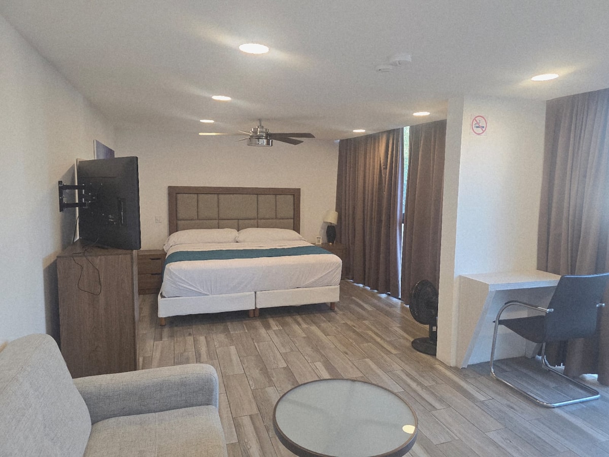 Disfruta de un espacio armonioso y funcional, ideal para familias que buscan comodidad en una de las zonas más vibrantes de Guadalajara. Equipada con una cama King Size ultra cómoda y una litera con dos camas individuales, esta habitación ofrece amenidades pensadas en tu confort: aire acondicionado, TV, WiFi, caja de seguridad y baño completo con regadera. Vive una experiencia única en la zona de fiesta y cultura de Chapultepec. Descubre los tesoros locales desde este moderno alojamiento.