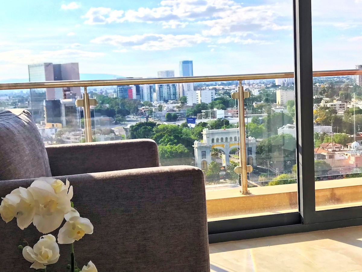 -22nd floor swimming pool -Beautiful gym with city views -Fully equipped for long stays -Parking available (at additional cost) - Housekeeping service: Once a week for reservation of +7 nights This deluxe studio with a balcony has everything you'll need for your stay. Located in a brand-new luxury tower in the Providencia neighborhood, near the Midtown Jalisco shopping mall.