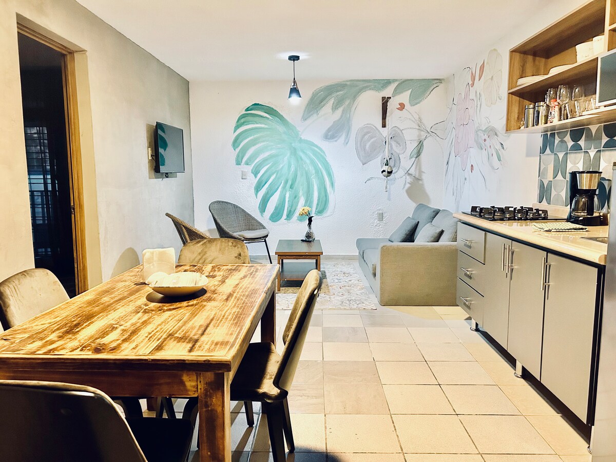 Dale a tus paseos, y a tus días, un punto de partida espectacular, en el que se conjugan diferentes estilos para brindar una experiencia única. Muebles rústicos, llenos de color, le dan vida a este moderno departamento. Su balcón es una joya. El departamento tipo estudio es un espacio abierto donde todas las actividades se intercomunican y sientes mucha amplitud, podrás disfrutar en todo momento del vínculo con la terraza que es a través de un ventanal muy grande que ofrece mucha iluminación al espacio interior y una vista espectacular a la ciudad, se convertirá en tu hogar y nuestro deseo más grande es que lo disfrutes al máximo, te esperamos!! En planta baja existe un Huerto Urbano donde puedes disfrutar de las múltiples variedades de plantas medicinales, comestibles y puedes realizar cosechas orgánicas para tu uso personal y enriquecer tu estancia. Te recomendamos que lo disfrutes ya que es un espacio muy lindo que fue diseñado con mucho cariño, nos encantaría que puedas vivirlo y gozarlo. Te esperamos!!! Para nosotros tu estancia y comodidad es lo más importante y estaremos atentos a cualquier necesidad que tengas para resolverla de inmediato, te esperamos con mucho gusto y disfruta de nuestro departamento que sin duda es tu mejor opción El departamento está ubicado en una zona tranquila, cultural y gastronómica, ideal para experimentar Guadalajara. Está a tres cuadras del Mercado Juárez o el Mercado México, y a 20 minutos caminando del centro histórico. Te recomendamos que puedas moverte y conocer la ciudad caminando, el departamento está perfectamente ubicado para experimentar Guadalajara, muy cerca del centro histórico, el paseo Chapultepec, en una zona tranquila, cultural y gastronómica. Muchos de los atractivos de nuestra hermosa ciudad podrás disfrutarlos sin necesitar gastar tu dinero con algún medio de transporte. La sensación de habitar el departamento es muy grata y acogedora cuando abres los ventanales y el espacio es uno solo integrado con la terraza lo disfrutarás mucho. Por la noche desde la terraza se observa a lo lejos el despegue de los aviones y es un espectáculo que lo puedes gozar. En la calle de libertad o en los alrededores del mercado Juarez (que de la terraza y volteando a la izquierda lo verás a 2 cuadras), podrás gozar de deliciosos desayunos en múltiples cafeterías, la gran mayoría tienen Terrazas con árboles y plantas, experimentaras momentos muy agradables y tranquilos.