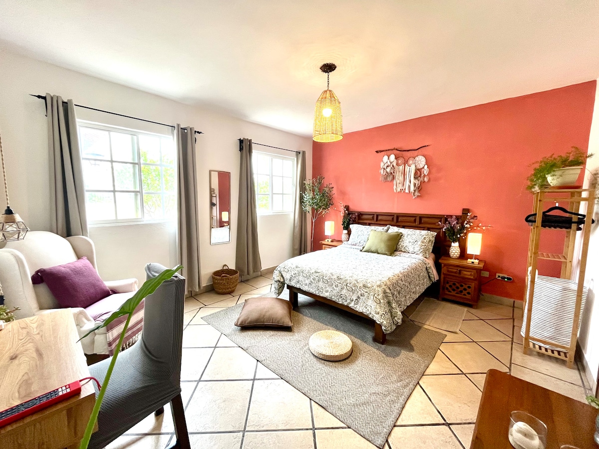 Nestled in a serene garden setting, our modern studio offers a tranquil escape just a short walk from the vibrant heart of San Miguel. Enjoy a restful stay with contemporary comforts: a plush queen-sized bed, high-speed Wi-Fi, and a fully equipped kitchenette. Start your mornings with coffee on the private patio, surrounded by lush greenery, and unwind in the evenings with a stroll to nearby cafes, galleries, and historic sites. Experience the ideal blend of relaxation and convenience.