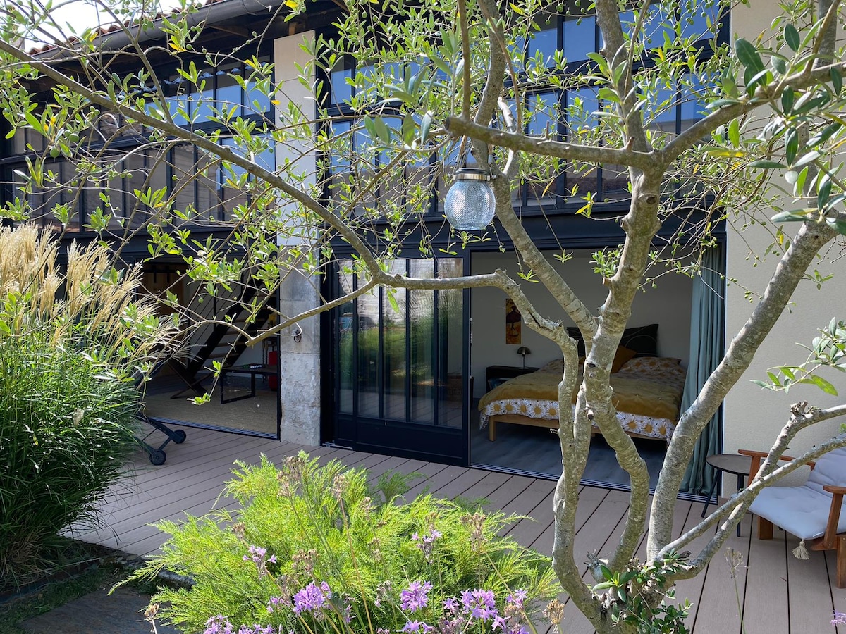 Ce logement tendance ne manque pas de charme. A 200m du centre village et des commerces, 800m des plages et du centre de thalasso, dans venelle au calme, spacieuse chambre d'hôtes entièrement indépendante exposée sud ouvrant sur un petit jardin d'agrément privatif et une terrasse en bois exotique. Accès indépendant. Équipements: wifi; four MO; réfrigérateur. Service: petit-déjeuner inclus dans la formule. Animaux non admis. Durée minimum de séjour: 4 nuitées.
