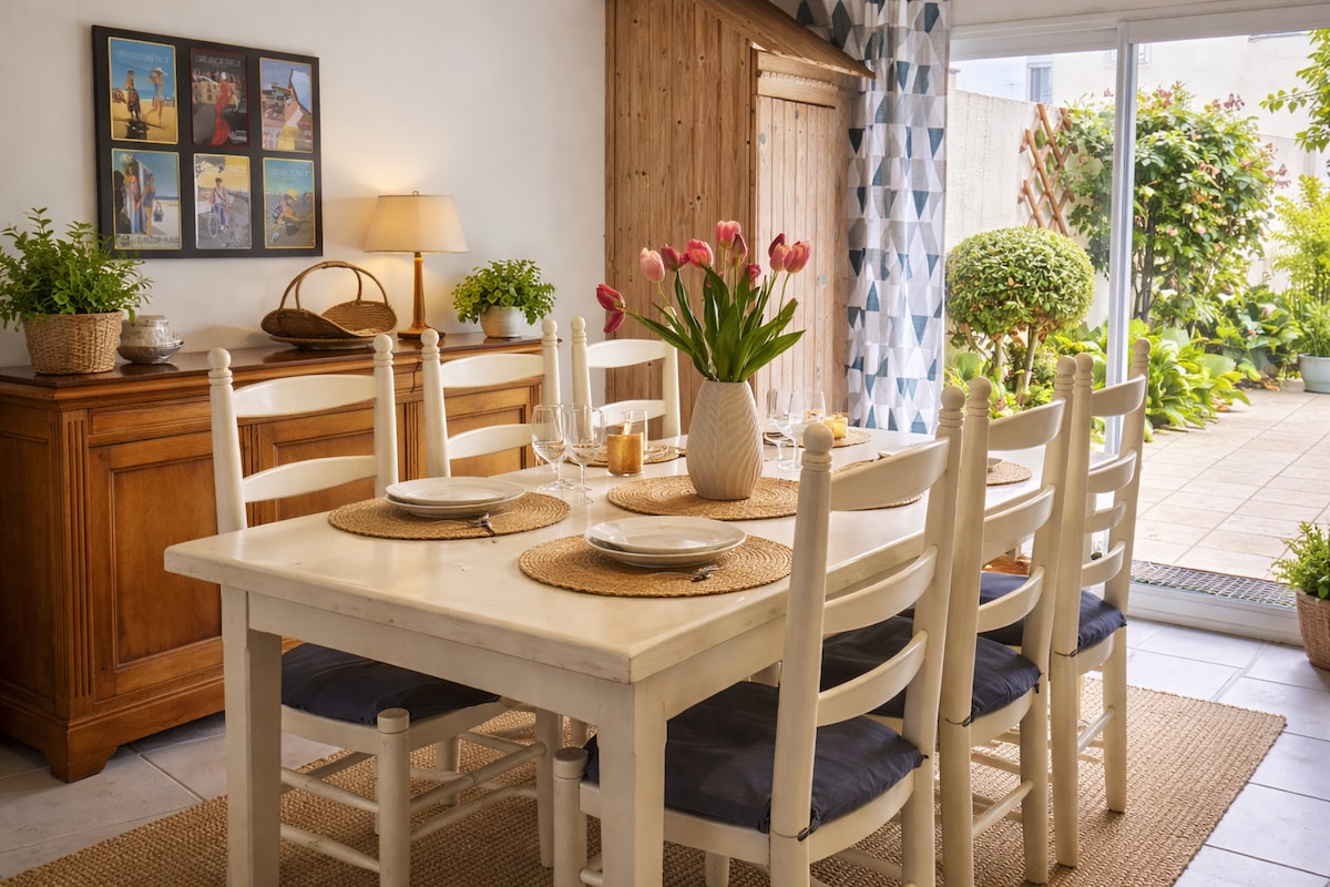 Récemment rénové, cet appartement à la décoration originale et marine vous mettra immédiatement dans l'ambiance de la Charente Maritime. Vous bénéficiez d'un grand séjour, d'une cuisine équipée, d'une grande chambre parentale, grande salle de bain, WC séparés, coin salon-bureau, (WIFI gratuit), place de parking (avec place pour 2 véhicules ou remorque) dans une cour privée et fermée, jardin avec table (barbecue). Les extérieurs sont en cours de rénovation, mais sans empêcher de s'y prélasser.